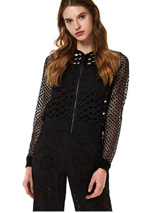 Create an accountblack lace bomber jacket with open-work stitching and a zip closure.