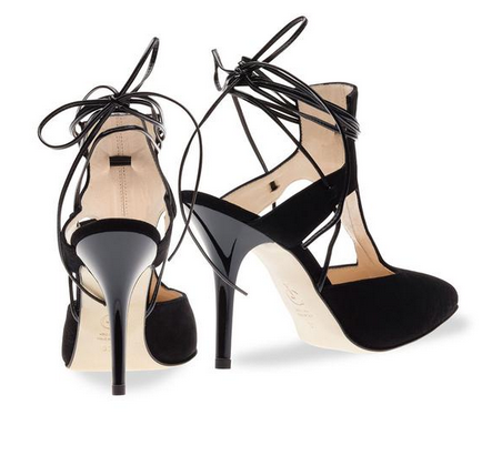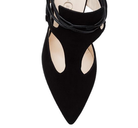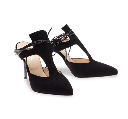 Create an account- Black suede pump with black leather lace-up straps.